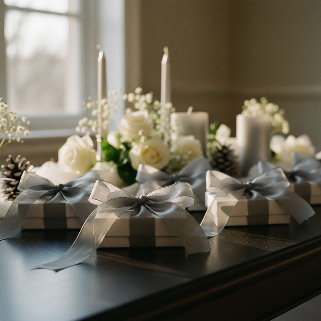 Perfecto para confeccionar bomboneras, paquetes regalo y composiciones florales en terrazas, galerías y jardines con un estilo elegante y luminoso. Ideal para bodas invernales, fiestas de Navidad y recepciones donde el color plata crea decoraciones refinadas y de gran impacto visual. Elegido por floristas, hoteles boutique, resorts y espacios de eventos para ligaduras, ramos y decoraciones navideñas coordinadas en paleta plata y blanco.